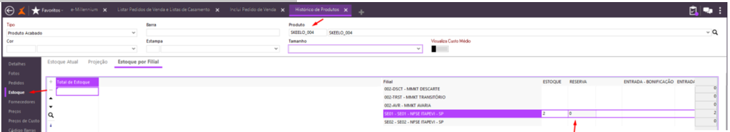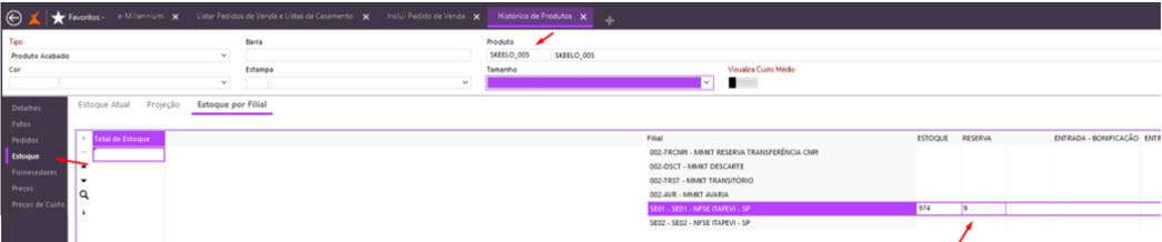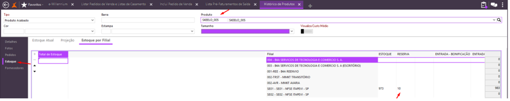 Consultando estoque dos produtos incluídos no pedido de venda