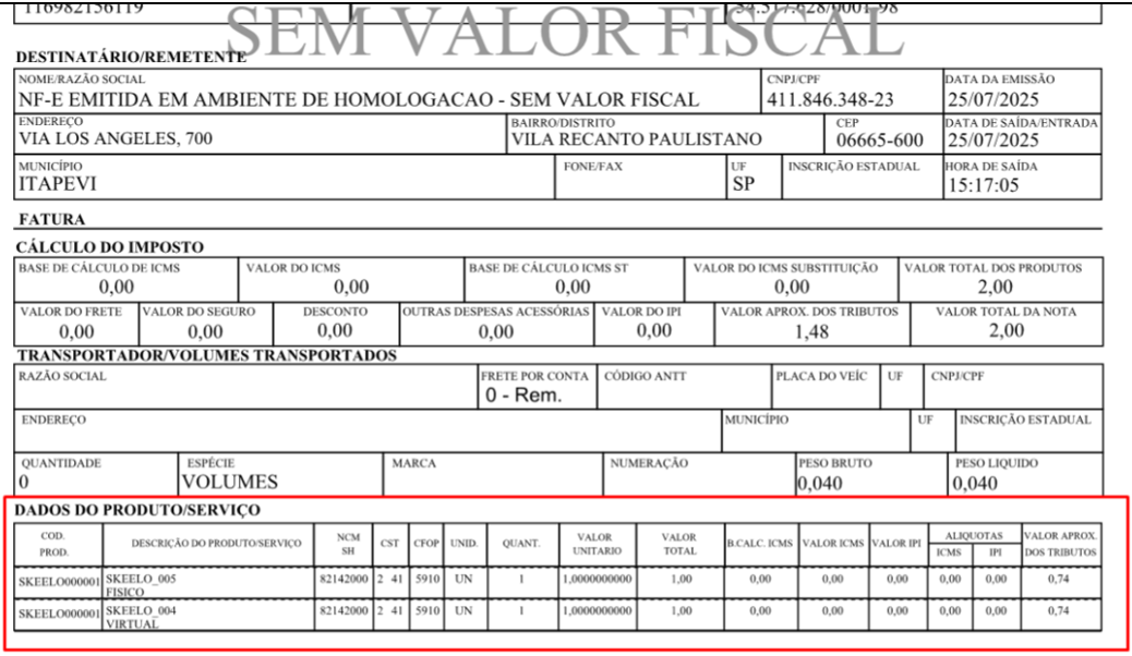 Após o faturamento, será emitida a nota fiscal contendo os produtos acabado e virtual, conforme o pedido de venda incluído no sistema.
