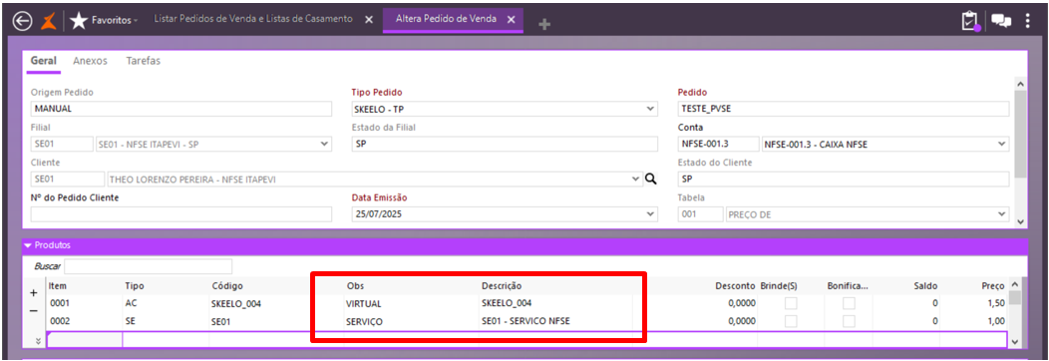 2.Após a inclusão dos pedidos de venda contendo produto virtual + serviço: