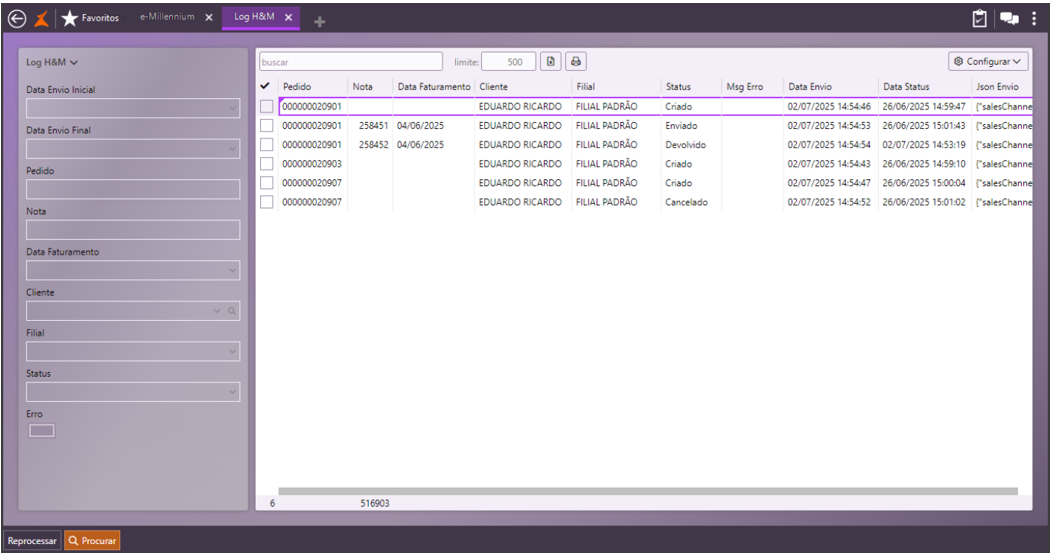 Em Vendas > Integrações > H&M, o sistema listará os resultados as informações dos dados enviados na integração, permitindo visualizar o status atual e possíveis falha de integração.