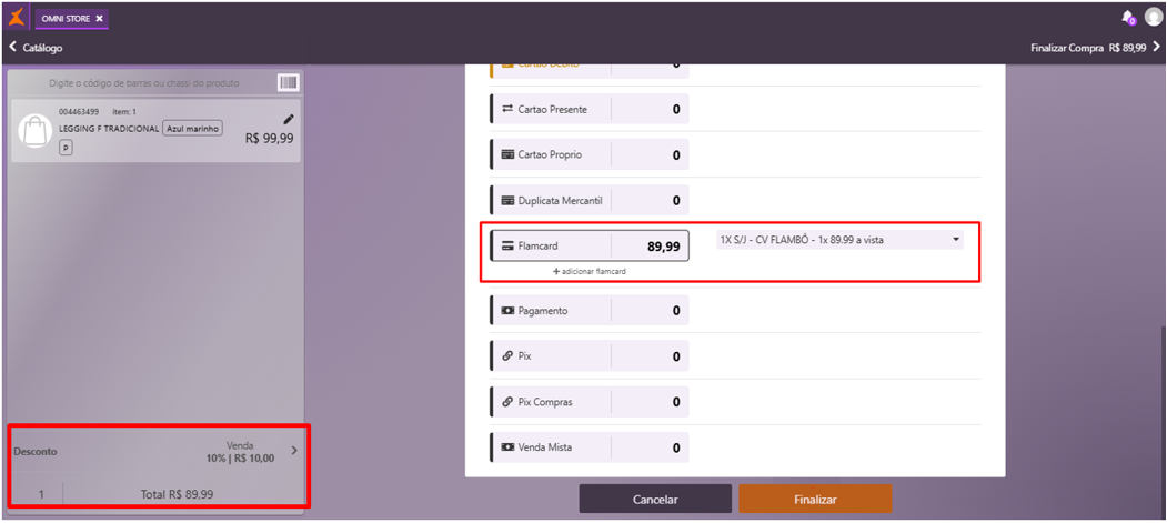 - Habilitado: O sistema deverá aplicar o desconto no nível do pedido (carrinho e rodapé) do registro Desconto Primeira Compra, na tela de Simulação de Parcelamento (PDV OMNI) e/ou quando a opção Cartão Flambô estiver selecionada na condição de pagamento e deverá atualizar o cadastro do cliente com a data e hora da primeira compra com o cartão Flambô, no momento da conclusão do pagamento.