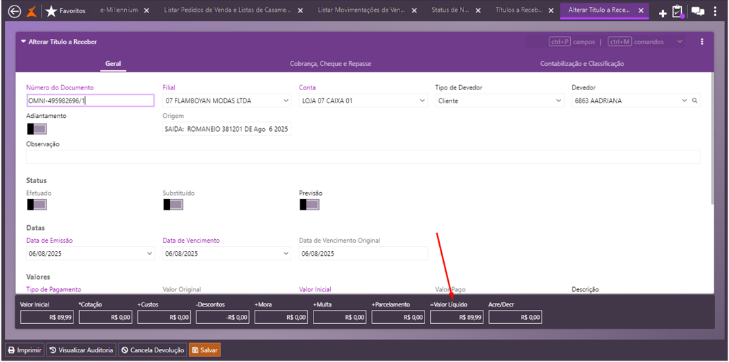 - Tipo de Pagamento cadastrado, tendo selecionado no campo Natureza a opção Cartão Próprio;