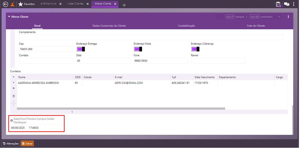 - Na guia Geral, verificar que o campo Data/Hora Primeira Compra Cartão Flamboyan foi preenchido com a informação da primeira compra feita pelo cliente.