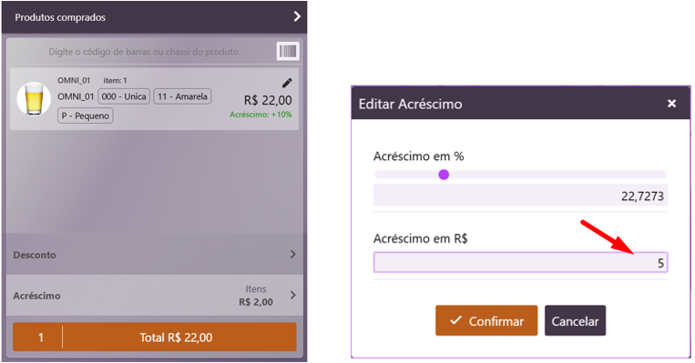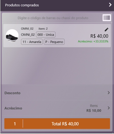 - Observe que o valor foi lançado no total da venda e o percentual de acréscimo foi exibido ao lado do nome do produto.