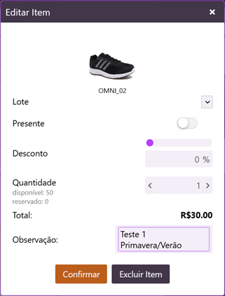 Se for necessário, na tela de edição de produto, também será possível incluir uma observação para o item, ou alterá-la.