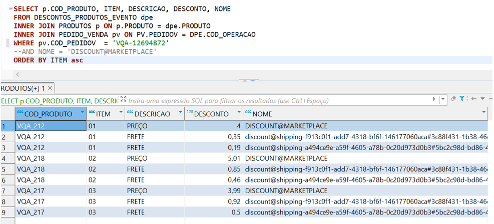 Será feita a busca dos nomes dos descontos (nas configurações gerais e tabela DESCONTOS_PRODUTOS_EVENTO) até encontrar o caractere " - ". Como exemplo, se o nome do desconto está como "discount@shipping-a494ce9e-a59f-4605-a78b-0c20d973d0b3#5bc2c98d-bd86-40aa-a0d7-92aa7dfc4168", o sistema vai considerar "discount@shipping", ou seja, até o primeiro caractere " - ".