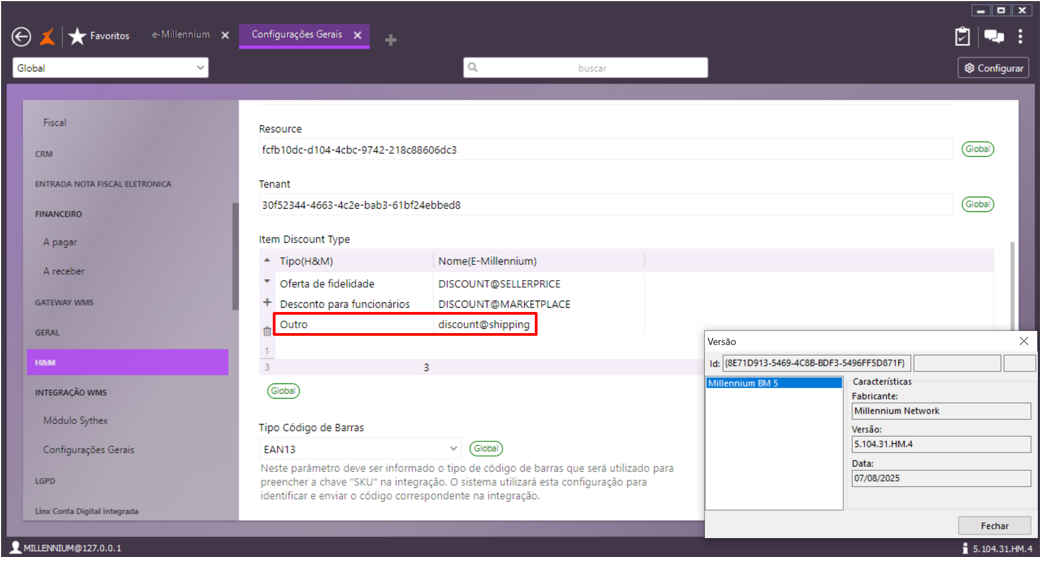 - Preencher a tabela Item Discount Type, fazendo um “De / Para” entre o campo o gravado no e-Millennium e o respectivo campo na H&M;