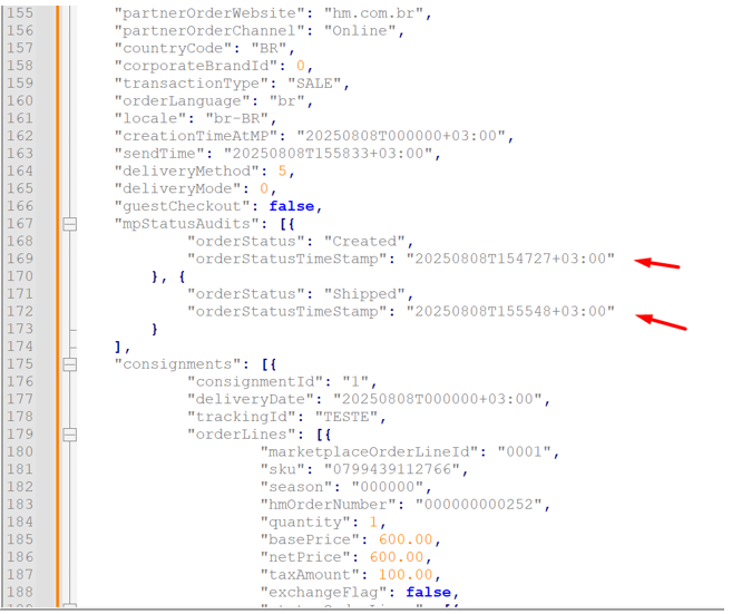 Quando for feita a alteração do status do volume para “Despachado”, não será mais registrado o status de "Shipped" para H&M: