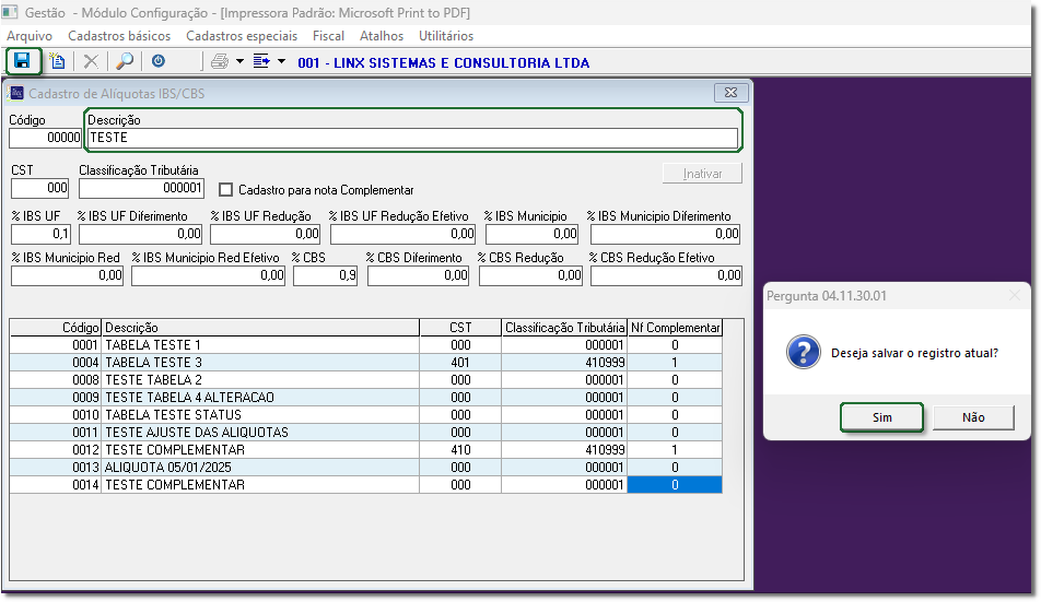 5. Exibirá a mensagem 'Deseja salvar o registro atual?', clique em 'Sim' para salvar.