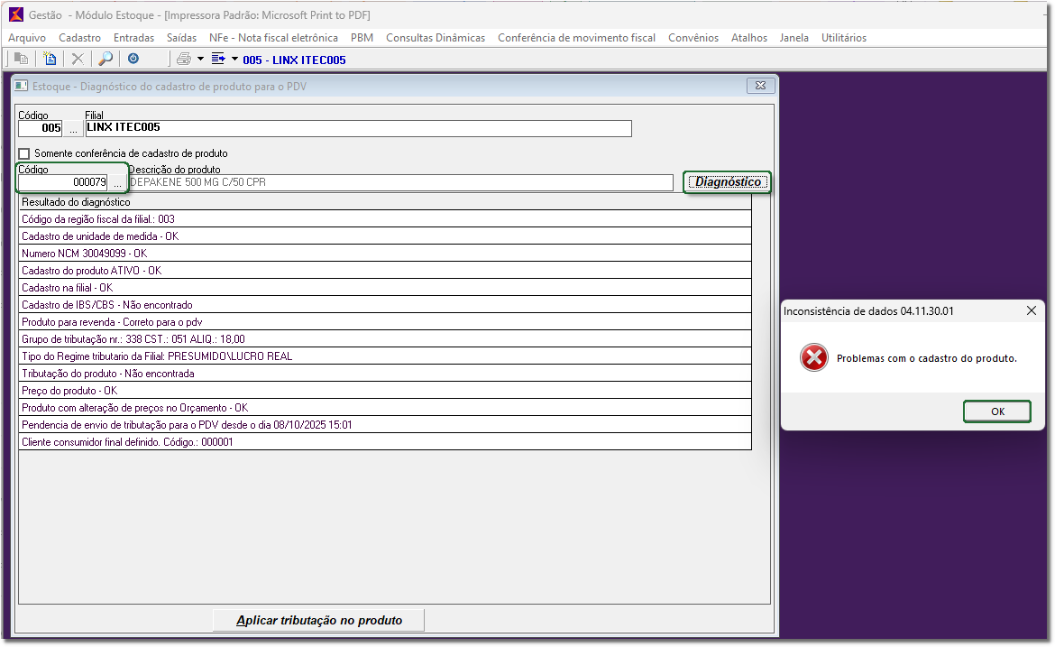 4. Clique no botão 'Diagnóstico' para verificar as conformidades do cadastro do produto informado;