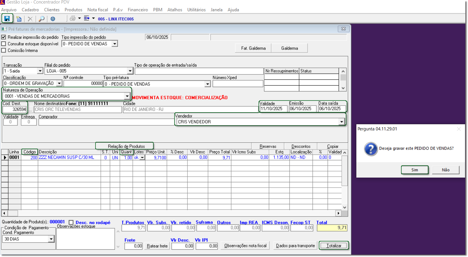 10 Será exibida a mensagem 'Deseja gravar este PEDIDO DE VENDAS?', clique em 'Sim';