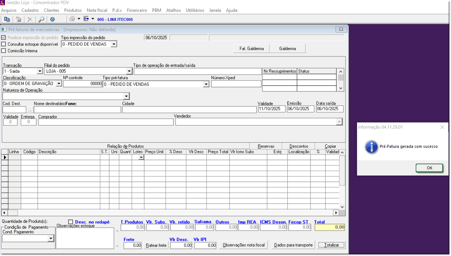 11. Apresentará a mensagem 'Pré-Fatura gerada com sucesso', clique em 'Ok' para concluir.