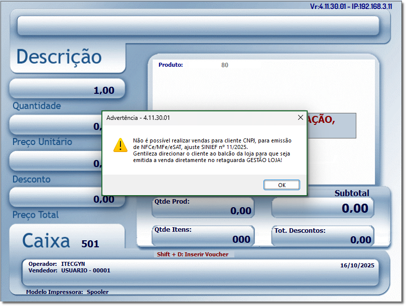 3. Na tela 'Identifica Consumidor', ao informar o CNPJ do cliente no campo 'CPF/CNPJ' e confirmar, será apresentada a mensagem 'Não é possível realizar vendas para cliente CNPJ, para emissão de NFCe /MFe/eSAT, ajuste SINIEF nº 11/2025. Gentileza direcionar o cliente ao balcão da loja para que seja emitida a venda diretamente no retaguarda GESTÃO LOJA!'