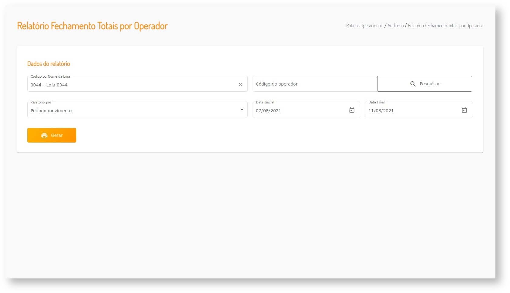 Permitir a geração do Relatório Fechamento Total de Operador por Período ou Data do Movimento.