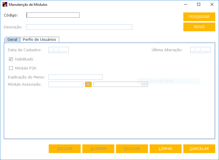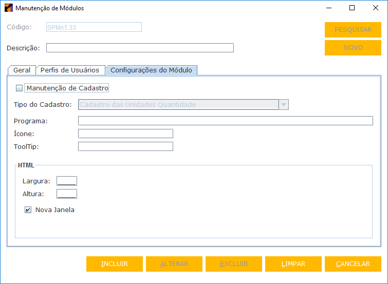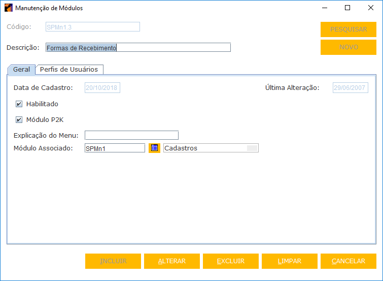 - MANUTENÇÃO DE CADASTRO: indicador de que o módulo que você está tentando cadastrar é uma funcionalidade de cadastro do sistema.