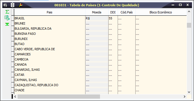 Esta tabela deve ser utilizada para cadastrar os países com os quais a empresa mantém relações comerciais. Os países são utilizados na localização dos estabelecimentos das filiais, clientes, fornecedores e representantes, além de identificar a moeda corrente e o bloco econômico do qual o país participa, viabilizando controles gerenciais de desempenho.