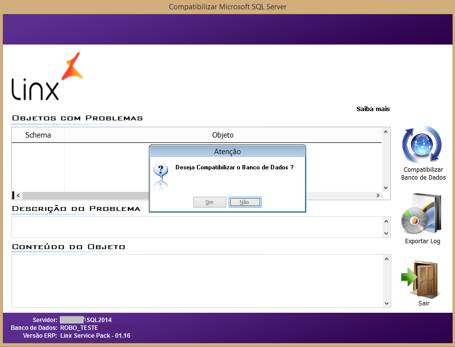 8. Se o utilitário ainda encontrar problemas, será exibida novamente a mensagem exibida no passo 6. Após solucioná-los, clique novamente em Compatibilizar Banco de Dados.