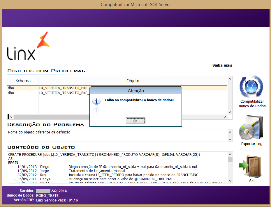 Ambientes que tiveram o SQL Server atualizado para a versão 2012/2014 que não efetuarem a compatibilização do banco de dados por meio desse utilitário poderão ter o funcionamento do Linx ERP, Linx ERP Franquia, Linx POS ou Linx POWS interrompido.