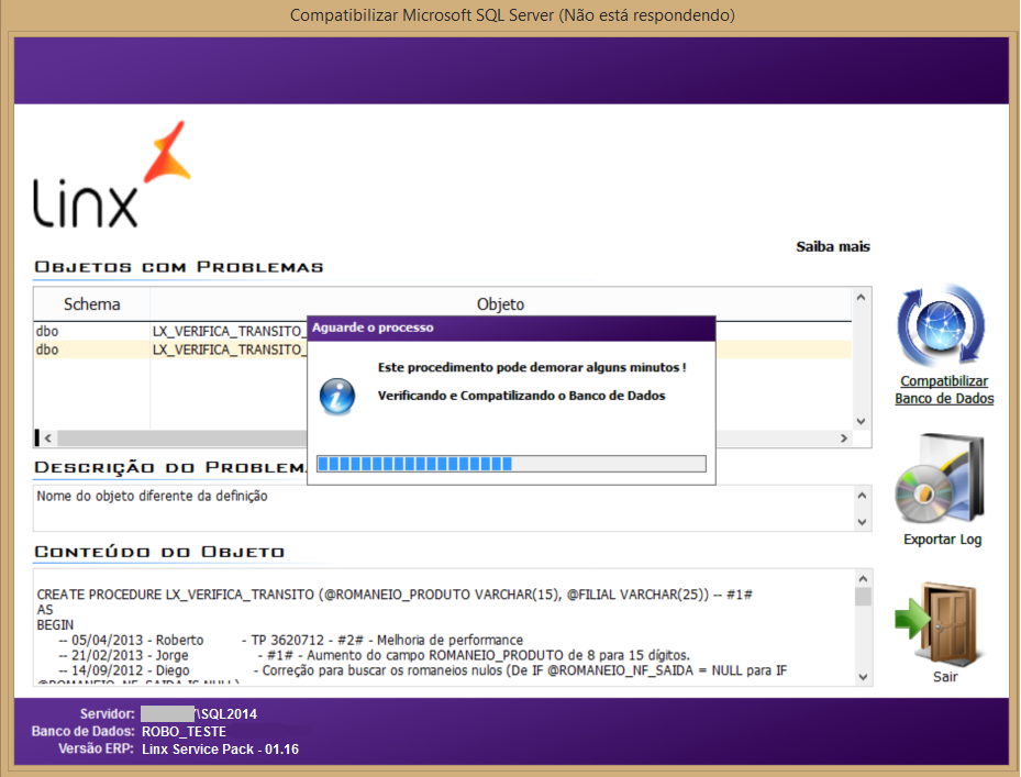 7. Após a intervenção acima, clique novamente em Compatibilizar Banco de Dados e aguarde até que o procedimento seja concluído.