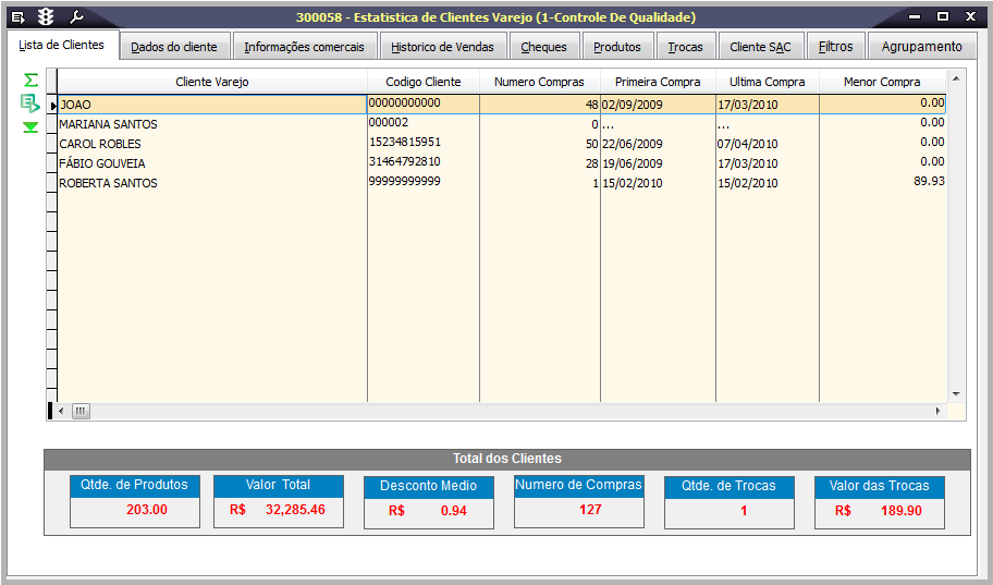 A tela de estatísticas de cliente é uma ferramenta para gestão do relacionamento com os clientes da base, já que permite consultar dados de histórico de compras, dados cadastrais, informações comercias, dados do endividamento, produtos comprados, produtos trocados, valores, formas de pagamento entre outros.