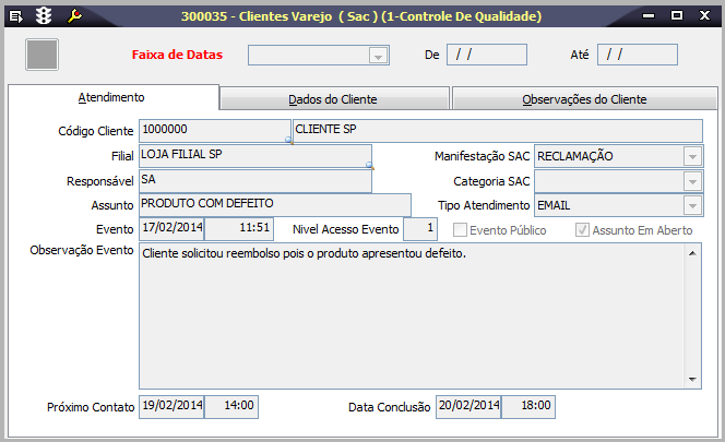 Página AtendimentoOs campos da página Atendimento deverão ser preenchidos com os dados do cliente e da sua solicitação ao SAC. | Página Atendimento | Código Cliente | Digite o código do cliente. Clicando com o botão direito do mouse o sistema abre a tabela com clientes cadastrados para seleção. | | Filial | Digite o nome da Filial. Clicando com o botão direito do mouse o sistema abre a tabela com as filiais cadastradas para seleção. | | Responsável | Digite o nome do responsável. | | Assunto | Digite o assunto do atendimento. | | Evento | Digite a data e hora do atendimento. | | Observação Evento | Digite as informações passadas pelo cliente e todos as informações referentes ao atendimento. | | Nivel Acesso Evento | Digite o nível de acesso do atendimento. | | Manifestação SAC | Selecione o tipo de manifestação do atendimento. | | Categoria SAC | Selecione a categoria. | | Tipo Atendimento | Selecione o tipo de atendimento. | | Próximo Contato | Digite a data do próximo contato com o cliente. | | Data Conclusão | Digita a data prevista para a conclusão do atendimento. |