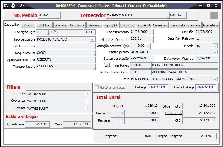 Página CabeçalhoOs campos do Cabeçalho serão sugeridos, conforme parametrização. Caso necessário, efetue as alterações desejadas. | Condição Pgto | O conteúdo deste campo indica como será feito o pagamento ao fornecedor da fatura gerada pelo pedido de compra. As informações são extraídas da tela 001011 - Condição de Pagamento para Compras e Entradas. Ao indicar um fornecedor no cabeçalho, este campo é preenchido automaticamente de acordo com as informações configuradas na tela 001016 - Fornecedores . A condição de pagamento indicada no pedido de compra será apresentada na entrada da nota fiscal e poderá ser modificada posteriormente, se necessário. | | Tipo de Compra | O tipo de compra identifica o pedido que está sendo cadastrado. O conteúdo deste campo é preenchido automaticamente de acordo com a configuração do parâmetro TIPO_COMPRA_DEFAULT, mas pode ser modificado, se necessário. As informações são extraídas da tela 004011 - Tipos de Compra. | | Ped. Fornecedor | Para facilitar a comunicação com o fornecedor, é possível indicar o número utilizado pelo fornecedor para identificação do pedido de compra que está sendo cadastrado. Caso necessário, digite neste campo a informação referente a identificação do pedido de compra no fornecedor. | | Requerido Por | Digite neste campo as informações para identificar o usuário ou o departamento que requisitou o pedido de compra. | | Aprov./Reprov. por | O conteúdo deste campo é preenchido automaticamente quando o campo Status Pedido é modificado para Aprovado ou Reprovado. É apresentado o usuário que está utilizando o sistema, além da data em que o status do pedido foi modificado. | | Transportadora | Informe a transportadora que será utilizada para realizar o transporte dos itens do pedido. O conteúdo deste campo é preenchido automaticamente – de acordo com a configuração do parâmetro TRANSPORTADORA_PADRÃO – mas pode ser modificado posteriormente. As informações são extraídas da tela 001012 - Transportadora. | | Frete a pagar | Eventualmente a empresa pode escolher arcar com todos os custos referentes ao transporte das mercadorias que estão sendo adquiridas. Caso necessário, marque este checkbox para indicar que o frete do transporte dos ítens do pedido será pago pela empresa – e não mais pelo fornecedor. | | Cadastramento | É apresentada neste campo a data em que o pedido de compra foi cadastrado no sistema. O conteúdo deste campo é preenchido automaticamente com a data corrente. | | Emissão | Neste campo é apresentada a data de emissão do pedido de compra, isto é, a data em que ele foi enviado ao fornecedor. | | Natureza Operação | Informe o código fiscal de identificação da operação de compra que está sendo realizada, para que seja feito o cálculo correto dos tributos sobre os itens do pedido. As informações são extraídas da tela 009048 - Natureza Fiscal de Operação para Entrada. | | Data Fat. Relativo | Informe neste campo a data a partir da qual será contada para aplicação da forma de pagamento. Exemplo:A emissão do pedido de compra e o recebimento no fornecedor foram feitos dia 20/01/2009. A data de faturamento relativo é dia 02/02/2009 e a condição de pagamento é de 15 dias corridos. O vencimento da fatura seria para 04/01/2009 (quinze dias após a data de emissão). Porém, com a data de faturamento relativo, a fatura será gerada com vencimento para 19/02/2008. Para utilizar a data de faturamento relativo e calcular o vencimento dos títulos gerados, é necessário configurar o parâmetro UTILIZA_DATA_FAT_RELATIVO. | | Variação Aceitável (%) | O fornecedor pode eventualmente enviar quantidades diferentes das descritas no pedido de compra, para mais ou para menos. Esta situação deve ser acordada entre a empresa e o fornecedor através de uma política comercial. É necessário informar no pedido a variação de quantidade aceita pela empresa, para que seja validada no momento da entrega. Informe neste campo a variação, em porcentagem, aceita para o pedido de compra que está sendo cadastrado. | | Moeda | O conteúdo deste campo é preenchido automaticamente e indica a moeda que será utilizada no pedido de compra. As informações são extraídas da tela 004001 - Moedas, e o preenchimento automático depende do parâmetro MOEDA_PADRAO. Quando uma moeda diferente da que foi definida como padrão é informada no pedido de compra, os campos referentes ao câmbio de valores são apresentados abaixo da área Saldo a Entregar. | | Status Pedido | Para identificar a situação do pedido de compra que está sendo cadastrado, é atribuído a ele um status - que pode ser modificado quando necessário - para indicar se o pedido está aprovado, reprovado ou se está aguardando avaliação. O status do pedido de compra é indicado neste campo, que é preenchido automaticamente conforme a configuração do parâmetro STATUS_COMPRA_DEFAULT. As informações são extraídas da tela 004013 - Status de Compras. A modificação do status do pedido é permitida de acordo com a configuração dos parâmetros COMPRAS_APROVACAO e NIVEL_APROVAR_COMPRAS. Também será verificado o nível de acesso do usuário que está acessando o sistema. | | Status Pedido | O conteúdo deste campo está vinculado ao campo Status Pedido e indica o nível de aprovação do pedido de compra, de acordo com as informações cadastradas na tela 004013 - Status de Compras. Este campo também está vinculado ao Tipo de Compra. No tipo de compra é possível configurar o controle de assinatura eletrônica para aprovação de documentos. Caso um tipo de compra que faça parte deste controle seja indicado no pedido, o conteúdo deste campo indicará o status de aprovação pertinente ao processo de assinatura. | | Filial Rateio | Eventualmente os custos do pedido de compra podem ser divididos entre as várias filiais da empresa. As informações referentes a esta divis