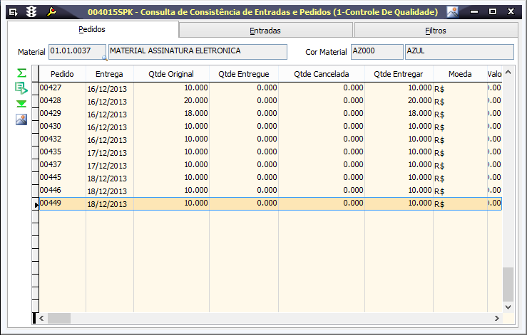 Página PedidosNesta página são apresentados os pedidos de compra pesquisados, conforme os filtros configurados na página Filtros. Observe a seguir a descrição dos principais campos da página | Material | Apresenta o material incluído no pedido de compra selecionado. Também é possível utilizar este campo como filtro para refinar a pesquisa dos pedidos de compra. Clique com o botão direito para abrir a tela de seleção de materiais. Serão apresentados na pesquisa apenas os pedidos que possuem o material indicado. | | Cor Material | Exibe a cor do material apresentado no campo 'Material'. | | Pedido | Apresenta o número dos pedidos de compra pesquisados. As informações neste campo são ordenadas conforme a numeração sequencial dos materiais incluídos em cada um dos pedidos de compra apresentados. | | Entrega | Exibe a data prevista para entrega dos itens do pedido de compra. | | Qtde Original | Apresenta a quantidade total de itens incluídos no pedido de compra. | | Qtde Entregue | Exibe a quantidade total de itens já entregues. | | Valor Original | Apresenta o valor total dos itens incluídos no pedido de compra. | | Valor Entregue | Exibe o valor total dos itens já entregues. |