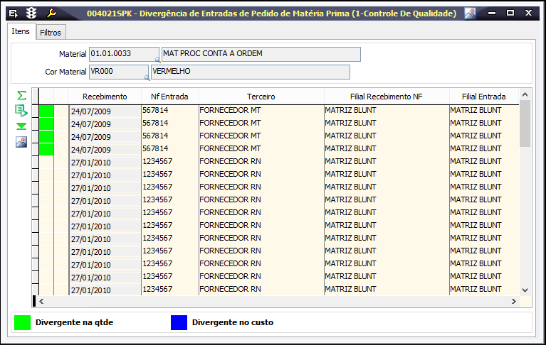 1. Acesse a tela 004021 - Divergência de Entradas de Pedido de Matéria Prima.