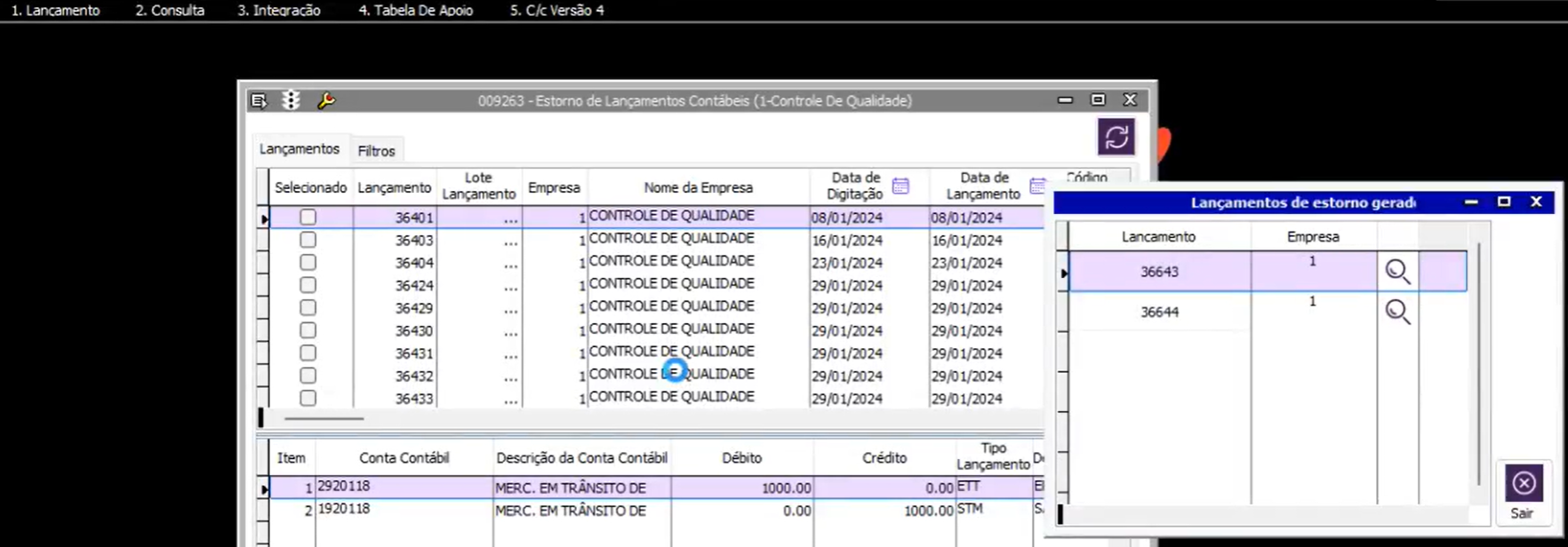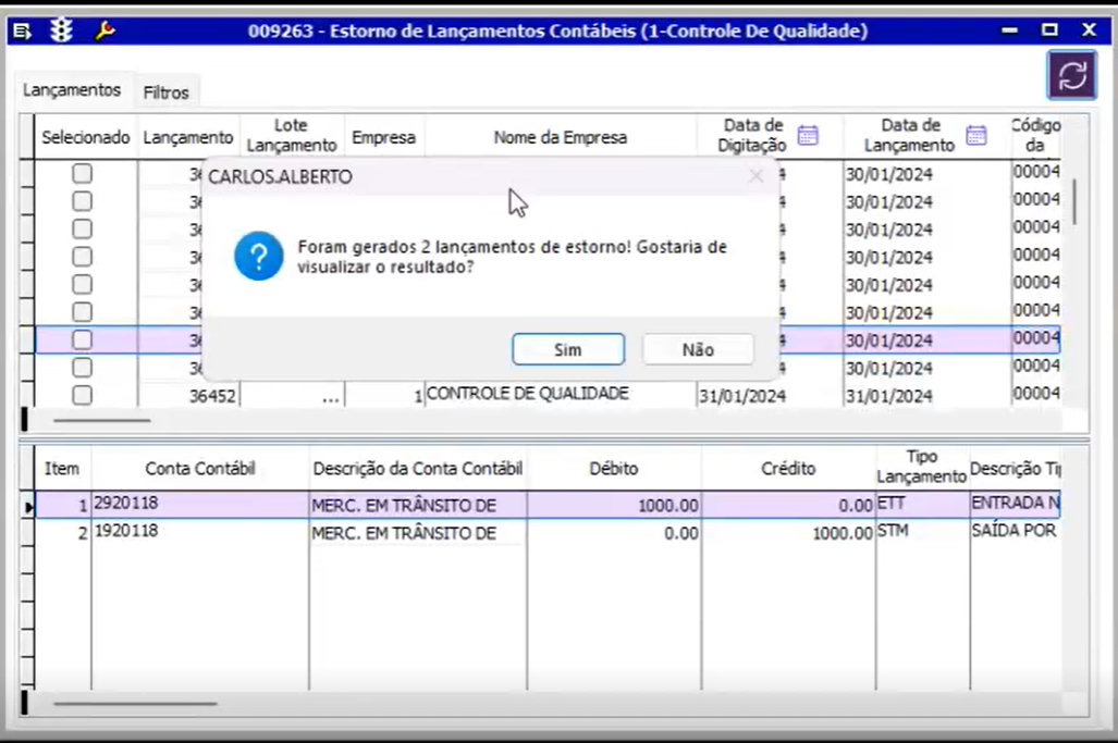Exibe mensagem se deseja visualizar os lançamentos de estorno. Se clicar em sim, mostra uma telinha com os lançamentos gerados e uma Lupa que direciona par a a tela 009018 - Lançamentos Contábeis, já com o lançamento preenchido e carrega-o na consulta.