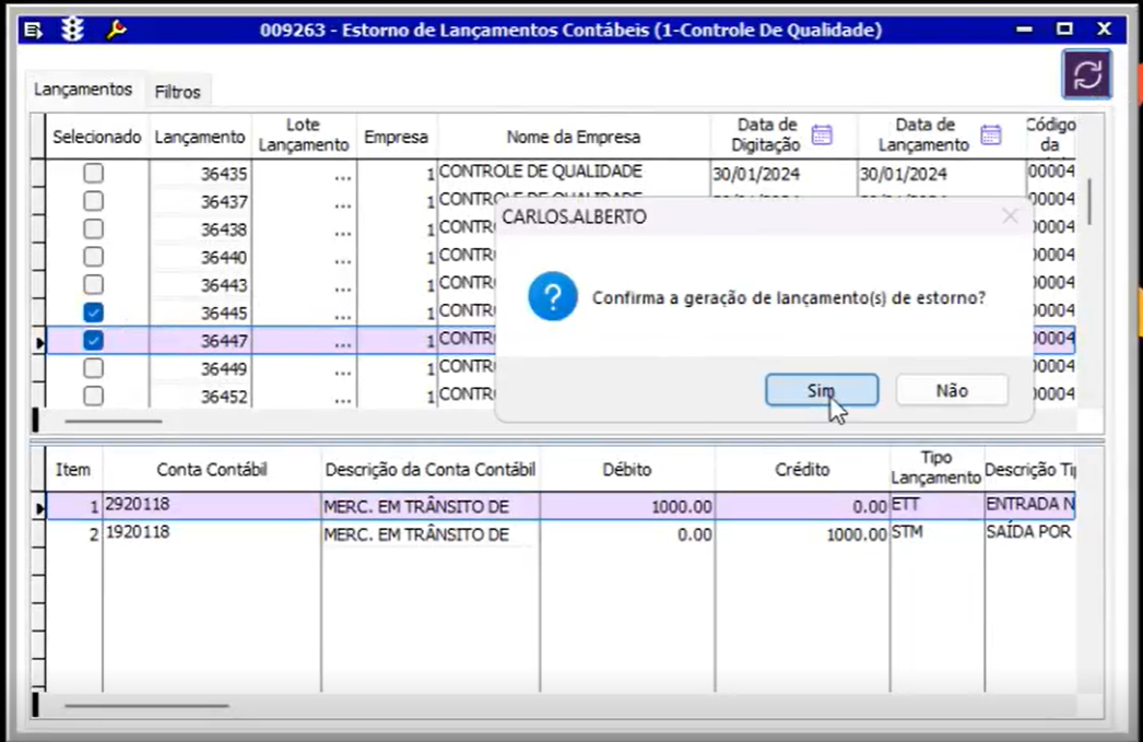 Clicando no botão estorno, o sistema irá gerar os lançamentos espelhados.
