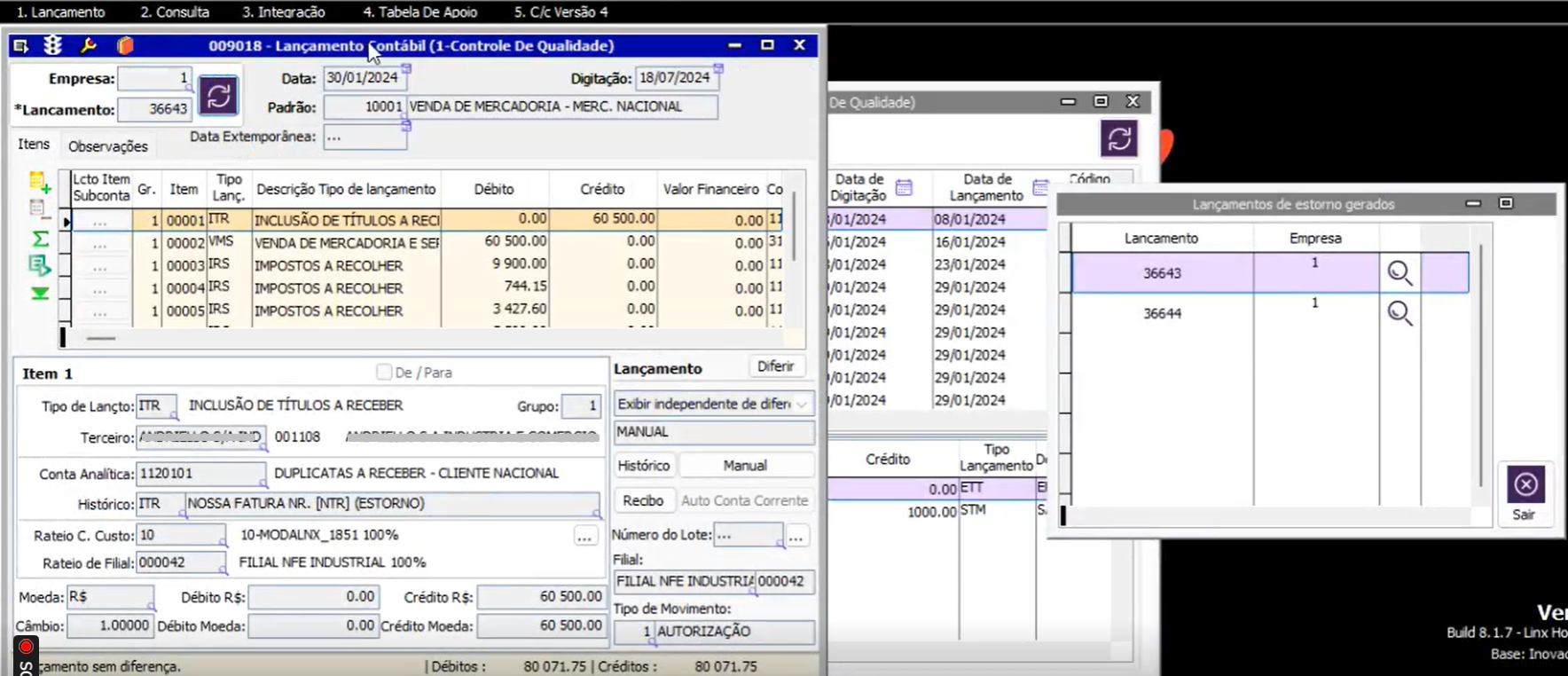 Exemplo: LMC (lançamento manual a crédito) contra um LMD (lançamento manual a débito).