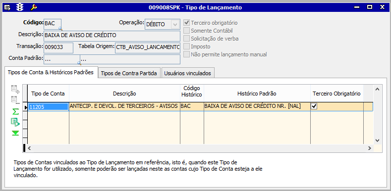 | Terceiro Obrigatório | O sistema preenche de acordo com o tipo de conta. |