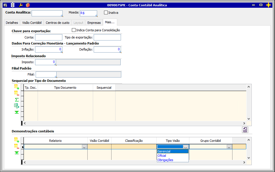 - Na coluna Tipo Visão existe um combobox com os tipos (Gerencial, Oficial, Obrigações)