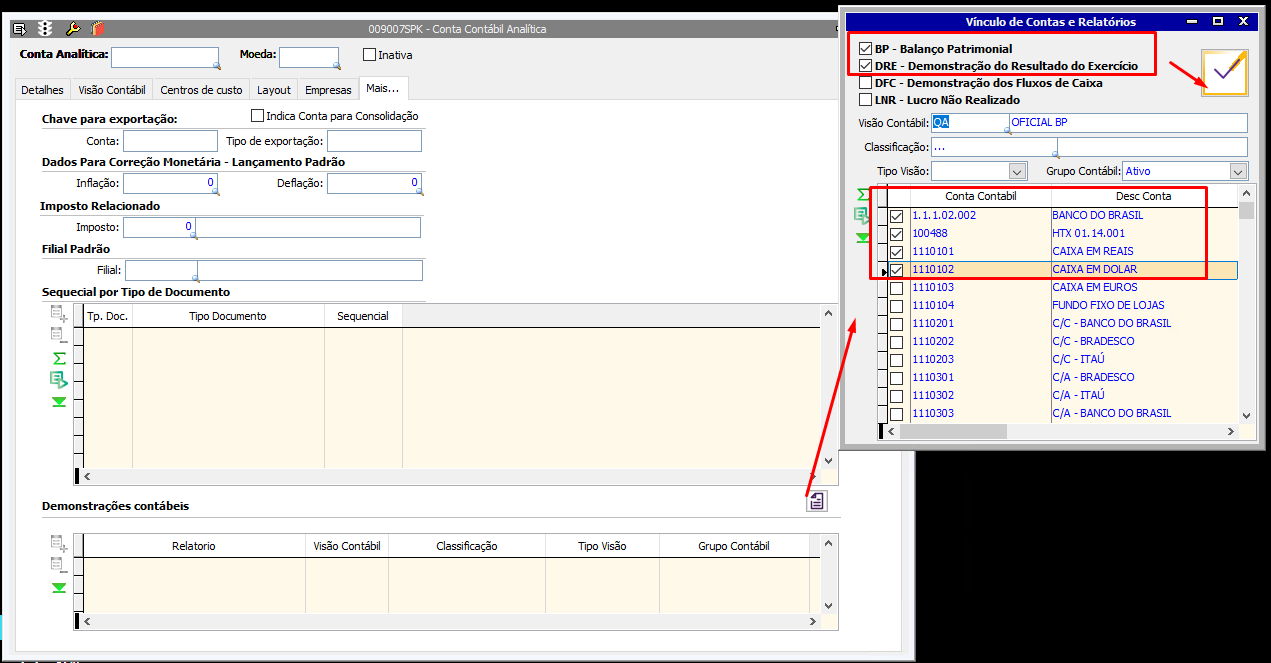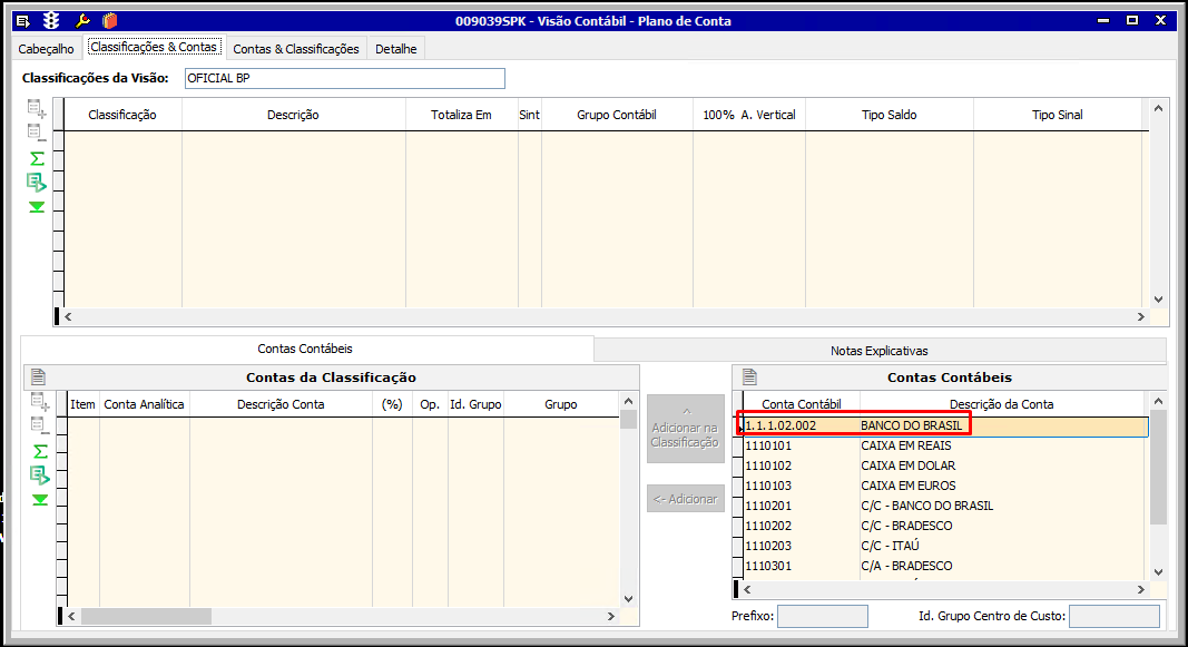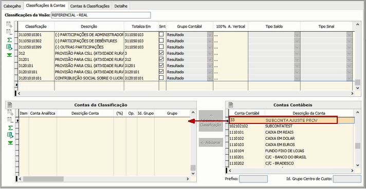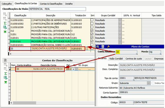 - Conta contábil vinculado a Lista de Contas e a aba Classificação & Contas