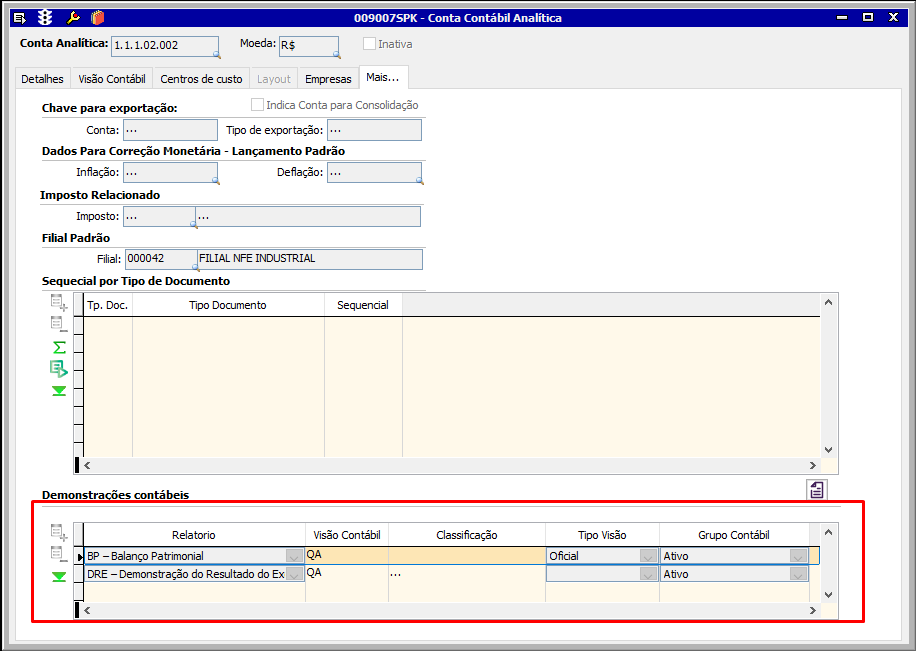 Filial Padrão | Utilizado para vínculo de filial quando a conta analítica for uma conta corrente. |