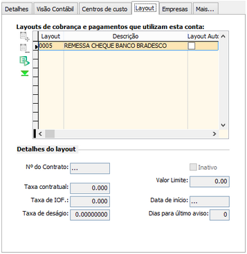 Na grade Layouts de cobrança e pagamentos que utilizam esta conta, clique no botão Inserir, localizado à esquerda da grade e selecione um dos itens disponíveis na tela para seleção.