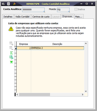 Na guia Empresas, caso utilize a contabilização para mais de uma empresa com os recursos de multi empresa em um mesmo banco de dados, clique no botão Inserir, localizado à esquerda da grade e selecione uma das opções disponíveis na tela. Caso não seja informada uma empresa e o sistema esteja parametrizado para trabalhar com multi empresa, a conta estará disponível para todas as empresas cadastradas.