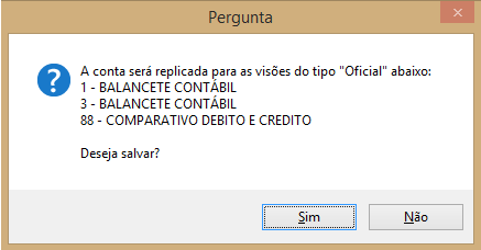 Sempre que for inclusa uma conta analítica a partir da tela 009007 - Conta Contábil Analítica, será exibida uma mensagem que indicará as visões contábeis já cadastradas cujo Tipo Visão = Oficial e solicitará confirmação do operador para efetuar a replicação.