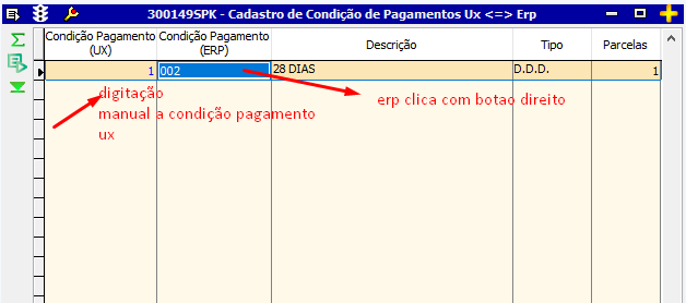 - Clique com o botão direito na tela Condição Pagamento (ERP) para realizar o vínculo da condição de pagamento do UX para a correspondente no ERP.