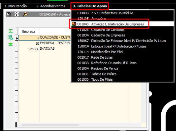 A tela 001046 - Ativação e Inativação de Empresa permite desabilitar o cadastro de empresas de franquias que tenham sido fechadas ou mudaram de CNPJ. Após a inativação, a empresa não será mais exibida em consultas porém o histórico destas franquias é mantido na base de dados do ERP.