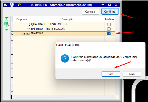 - Clique no botão Confirmar para salvar a operação. Conforme seleção, a lista de empresa deixa de apresentar a(s) empresa(s) inativada(s);