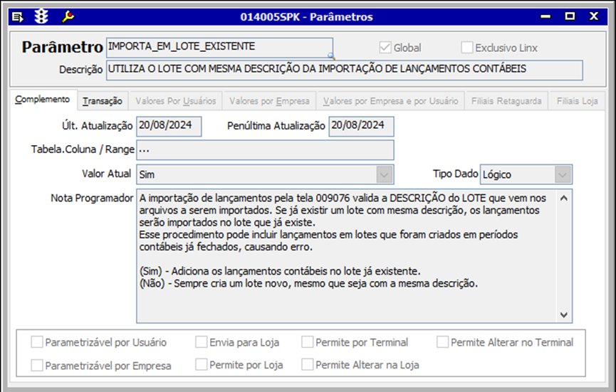 • Parâmetro IMPORTA_EM_LOTE_EXISTENTE valor atual SIM