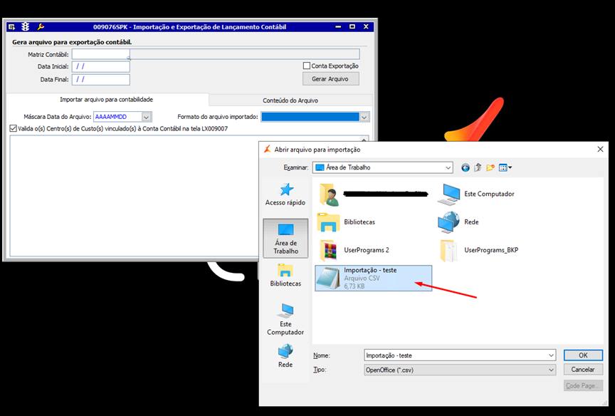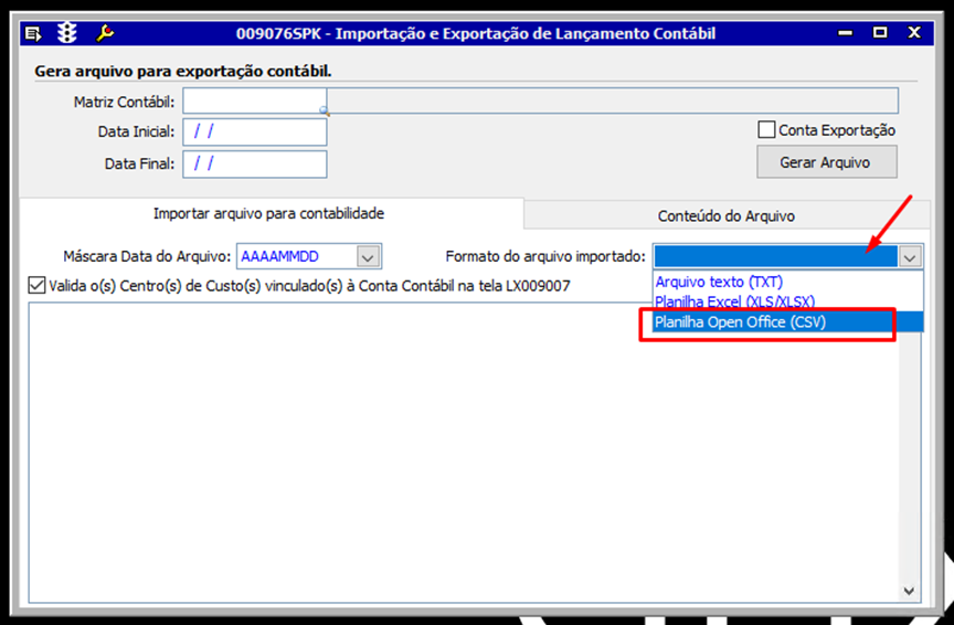 • Na tela 009076 - Importação e Exportação de Lançamento Contábil é possível escolher o formato do arquivo que deseja fazer a importação. (no caso usamos o CSV)