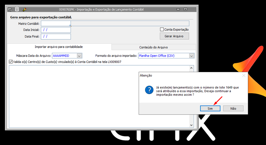 • Ao selecionar novamente o mesmo arquivo para importação é apresentado a seguinte mensagem: Ja existe(m) lançamento(s) com o número de lote XXXX que será atribuido à essa importação. Deseja continuar a importação mesmo assim? (Neste caso clicamos no SIM)