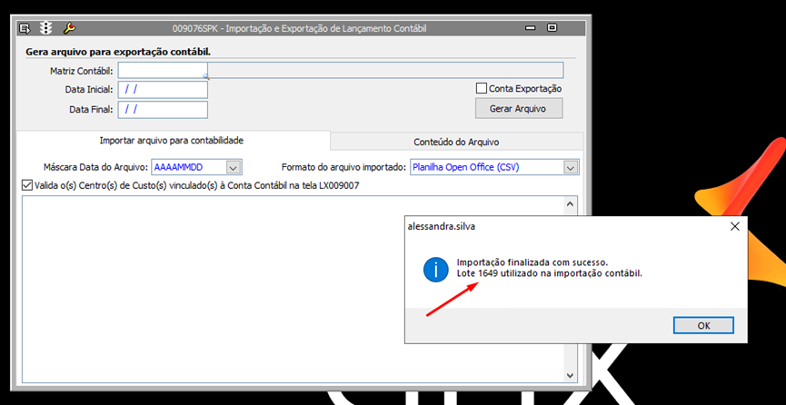 Importação finalizada com Sucesso. Lote XXXX utilizado na Importação contábil.