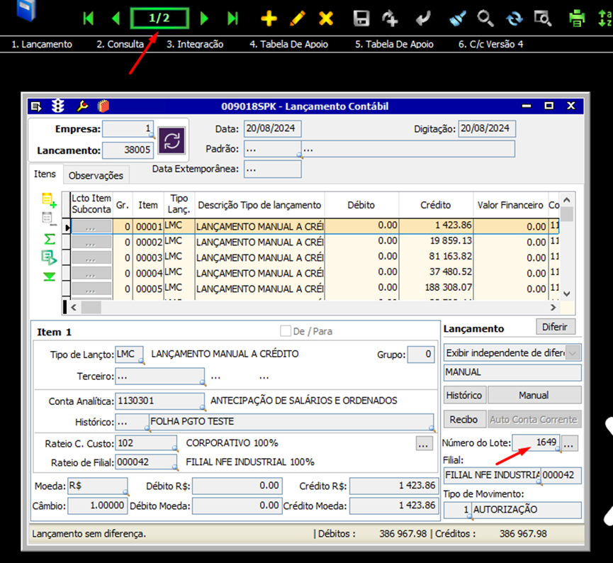 • Quando é pesquisado o lote na tela 009018-Lançamento Contábil é possível ver que foi gerado dois lançamentos para o mesmo lote importado.