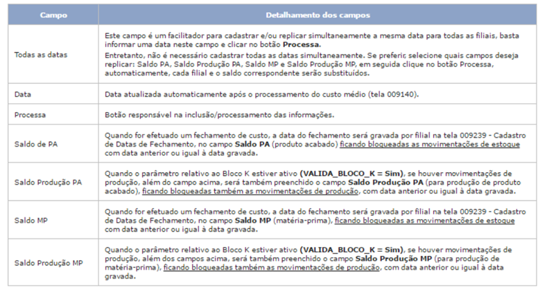 Quando for efetuado um fechamento de custo com a opção Por filial habilitada (009140), a data do fechamento será gravada por filial na tela 009239 - Cadastro de Datas de Fechamento, no campo Saldo PA (para produto acabado) e no campo Saldo MP (para matéria-prima), ficando bloqueadas as movimentações de estoque com data anterior ou igual à data gravada.