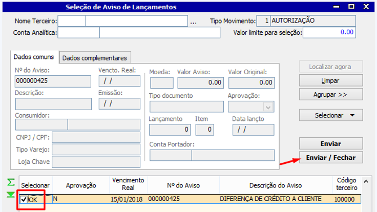 Na sequência selecione o aviso para a baixa e clique em Enviar/Fechar: