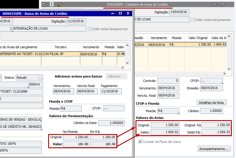 | Valores da Movimentação | Na tela da baixa (009033), observe o valor original do aviso de crédito e o valor baixado na movimentação. Após a baixa, veja que esta será deduzida do saldo atual do aviso, e essa informação será atualizada na tela de cadastro (009020). Exemplo: |