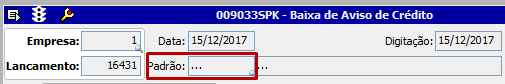 Padrão | Quando tratar-se de um aviso de crédito baixado manualmente, esse campo será preenchido pelo sistema com reticências. Quando tratar-se de uma baixa gerada automaticamente pelo sistema, quando ocorre uma compra paga com GiftCard na loja, por exemplo, esse campo será preenchido com o lançamento padrão utilizado. |